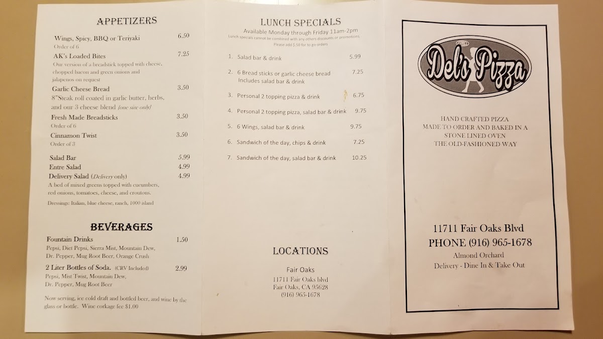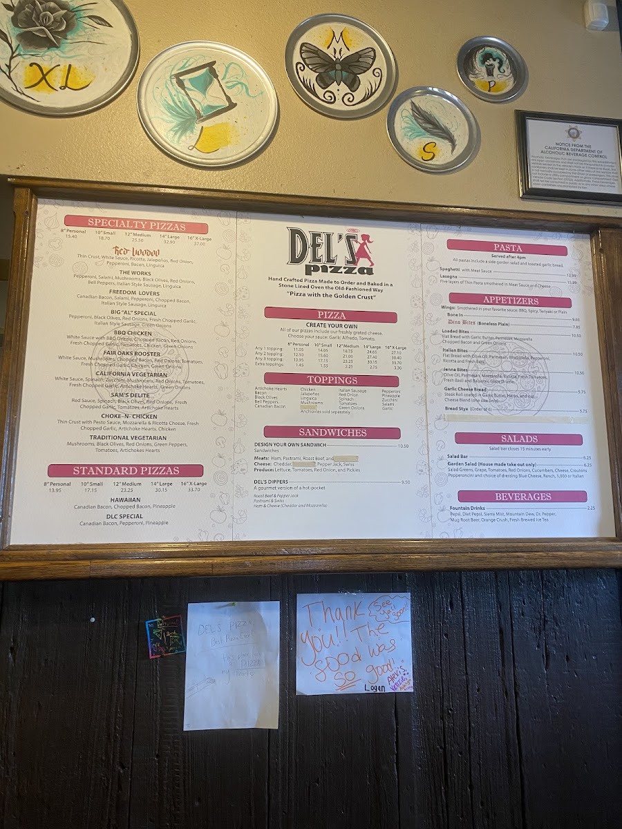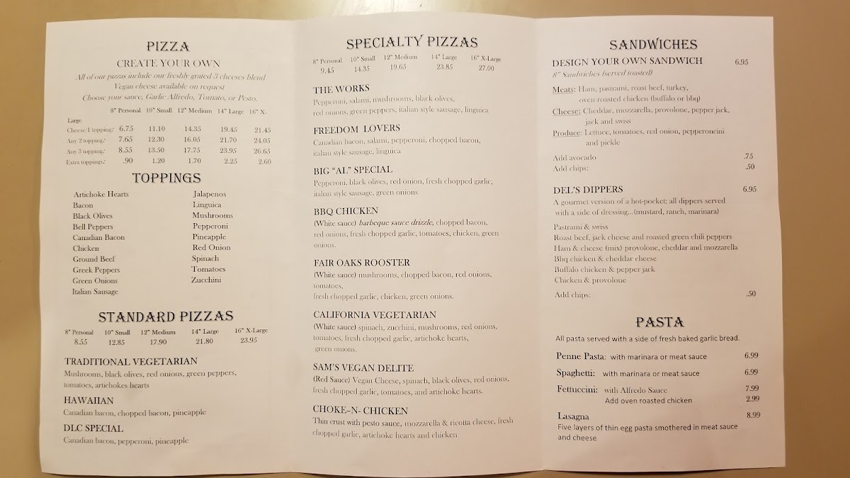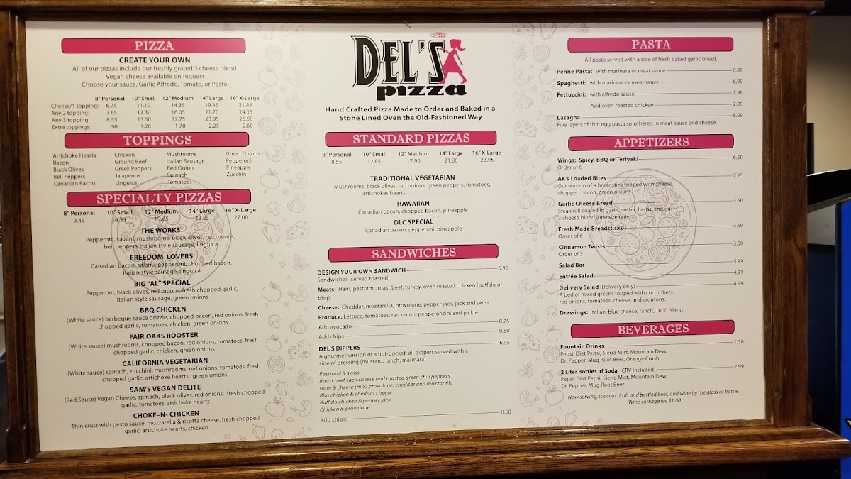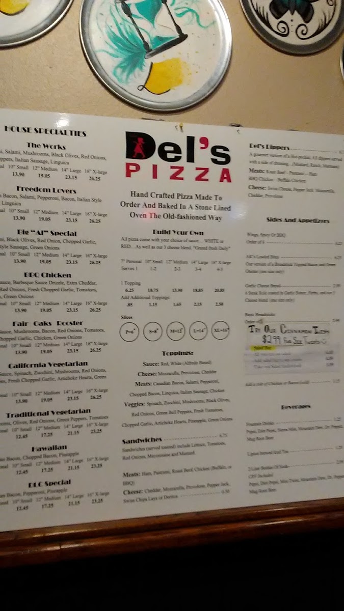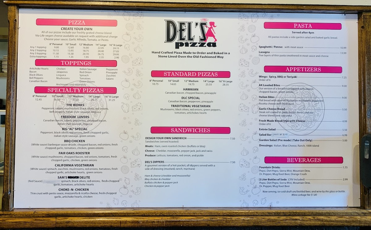 The menu at Del’s Family Pizza offers a relaxed, approachable selection that feels right at home in a neighborhood gathering spot. With a focus on comforting, familiar flavors, the variety ranges from classic cheese and pepperoni pizzas to specialty combinations like the California Vegetarian and Chicken & Artichoke with Vegan Cheese. Whether you’re grabbing a casual family dinner, ordering delivery for a laid-back night in, or stopping by to enjoy the live music and friendly atmosphere, the menu supports easy enjoyment at any time.